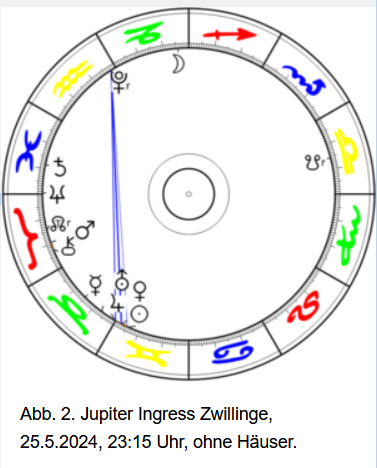 Jupiter tritt am 26. Mai 2024 in das Zeichen Zwillinge ein und bleibt dort bis 9. Juni 2025. Da Jupiter ungefähr 12 Jahre durch den gesamten Tierkreis benötigt, hält