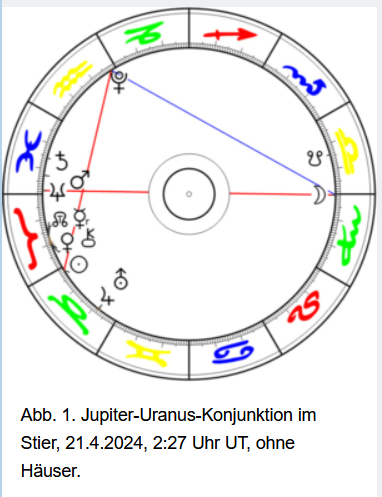 Am 21. April 2024 ereignete sich eine Jupiter-Uranus-Konjunktion im Stier. Wenige Tage vor der exakten Konjunktion von Jupiter und Uranus brannte das Gebäude der