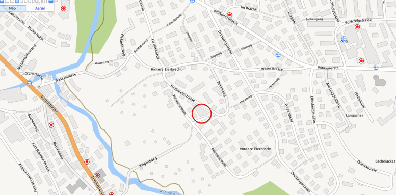 und den Hirtenweg fortsetzen (3 Minuten) bis zum Burenweg. Danach münden Sie rechts in die Eierbrechtstrasse ein. Der Fussweg dauert insgesamt ca. 7 Minuten.