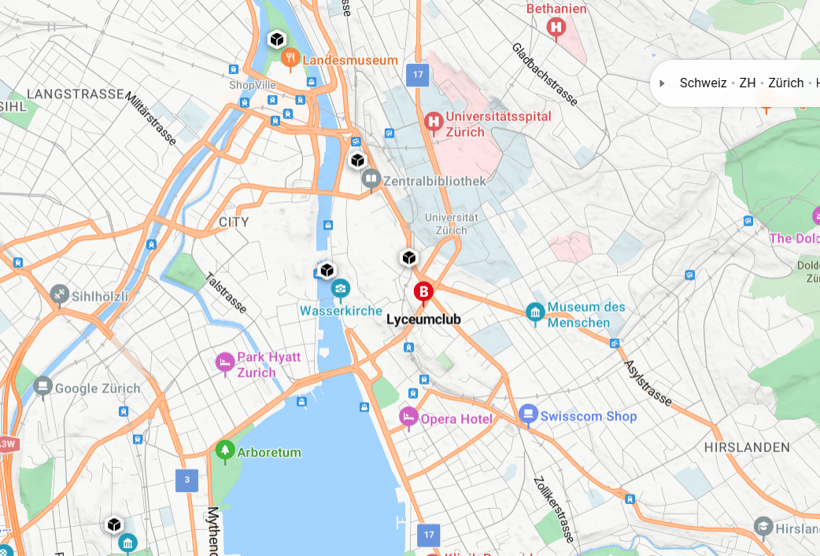 5.2.Variante ab Hauptbahnhof Zürich mit Strassenbahn Nr. 3 und Bus Nrn. 31 und 34 bis Haltestelle Waserstrasse; Wegbeschreibung wie folgt:
