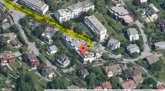 und den Hirtenweg fortsetzen (3 Minuten) bis zum Burenweg. Danach münden Sie rechts in die Eierbrechtstrasse ein. Der Fussweg dauert insgesamt ca. 7 Minuten.