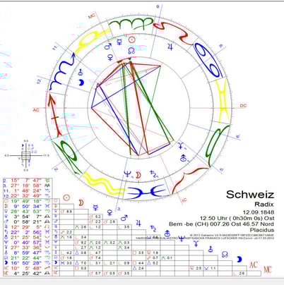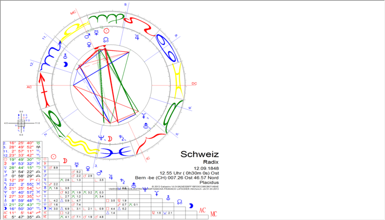 Das Verfassungshoroskop mit dieser Zeit (12.55 Uhr) mit dem Aszendenten in Schütze und einem stark besetzten 9. Haus betont die internationale Bedeutung der Schweiz. Der Geburtsherr Jupiter steht im 8. Haus, was ein Hinweis auf die gut aufgestellte Kreditwirtschaft sein mag, die gleichsam ein Markenzeichen der Schweiz ist. „Plausibel“ ist die Zeit „kurz vor 1 Uhr“ sicherlich.
