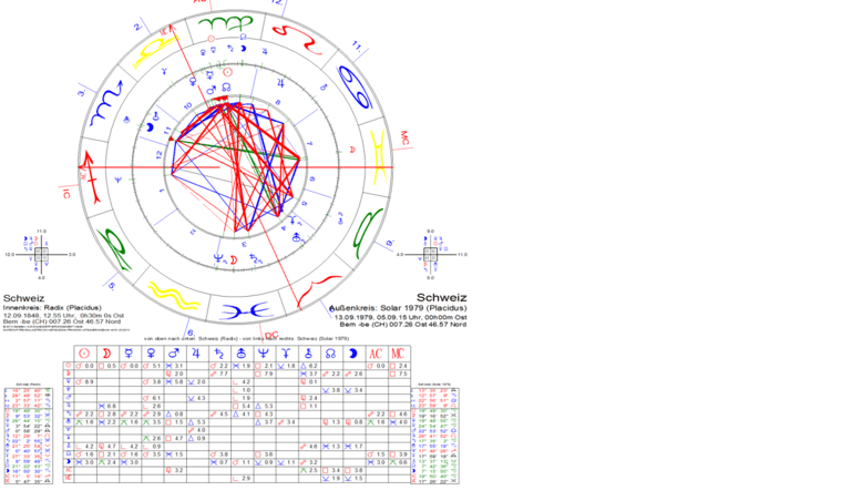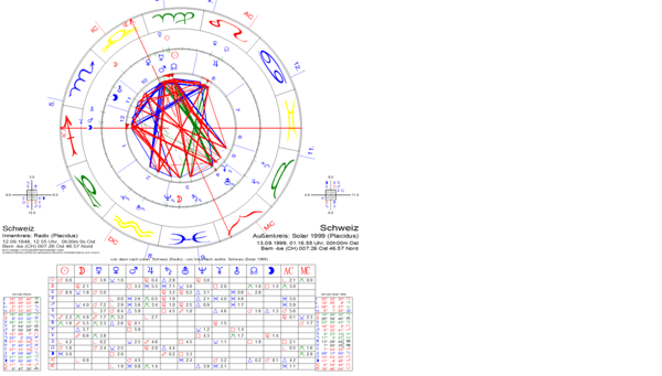 zeigt Uranus (20.37 Zwillinge) und absteigenden Mondknoten (20.30 Zwillinge) fast minutengenau am Solar-Aszendenten (20.47 Zwillinge): Eine neue (Uranus) Entwicklung kommt auf das Land zu, die als eine „Lebensaufgabe“(Mondknoten) betrachtet werden kann. Schon diese sehr genaue achsenbezogene Stellung bietet ein Argument für die korrekte Stellung des Solar-Aszendenten, also zugleich für die „Geburtszeit“ der Schweiz „kurz vor 1 Uhr“ (12.55 Uhr). Mond und Pluto in Konjunktion im 12. Haus verweisen zusätzlich auf eine intensive (Pluto) soziale und spirituelle (12. Haus) Dynamik, die vorwiegend emotional (Mond, noch dazu erhöht im Zeichen Stier) getragen ist. Ein Hauptargument ist die Stellung der Jupiter/Neptun-Opposition im Solar. Die Kombination dieser beiden Planeten hat ja Menschenfreundlichkeit, Hilfsbereitschaft, Barmherzigkeit zum Thema. Der Solar-Jupiter (auf 03.53 Waage) und der Solar-Neptun (auf 02.49 Widder) stehen nahe an der MC/IC-Achse des zugehörigen (unkorrigierten) Radix.
