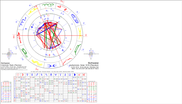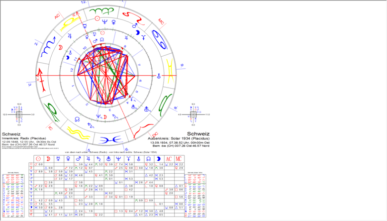 in dessen zeitlichen Gültigkeitsbereich die Erarbeitung und Beschlussfassung der ersten „Genfer Konvention“ fällt, hat einen Aszendenten auf 00.26 Jungfrau – Quadrat Mondknoten-solar auf 00.26 Schütze. Zugleich bildet der Solar-Aszendent eine recht exakte Opposition zum Radix-Neptun (auf 00.41 Fische). Der Solar-Neptun (auf 05.06 Widder) bewegt sich auch in diesem Solar auf dem IC des (unkorrigierten) Radix (bei 05.52 Widder). Die altruistischen, freundlichen, all-liebenden Motive sind auch jetzt stark. Das Solar zeigt übrigens eine Neumond-Stellung; man könnte nun an den konkreten Beginn dessen denken, was im Jahr zuvor uranisch als neuer Impuls auftrat. Und konkret wird es nun mit dem Strukturen schaffenden Saturn auf 6.19 Waage, also am Medium Coeli des unkorrigierten Radix. Die erste „Genfer Konvention“ und ihr Zustandekommen bei internationaler Beteiligung unter Schweizer Federführung begründet die internationale Bedeutung der Schweiz im eigentlichen und konkreten Sinn.